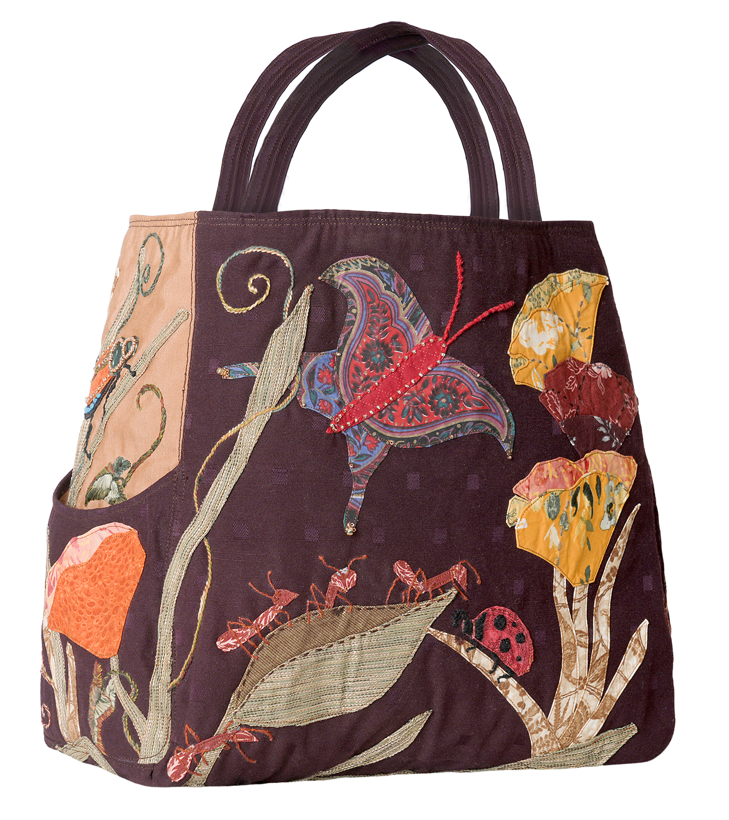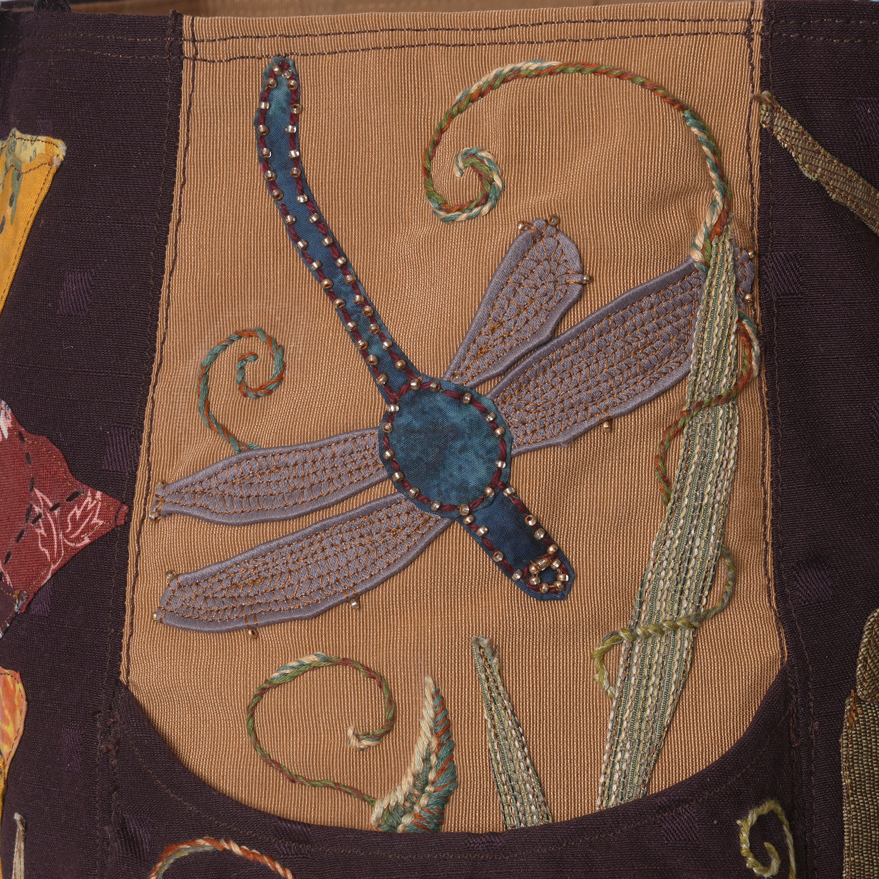 upholstery fabric, cotton fabric, embroidery thread, bead embellishmentsoriginal design bag construction, appliqué, hand embroideryprivate collection